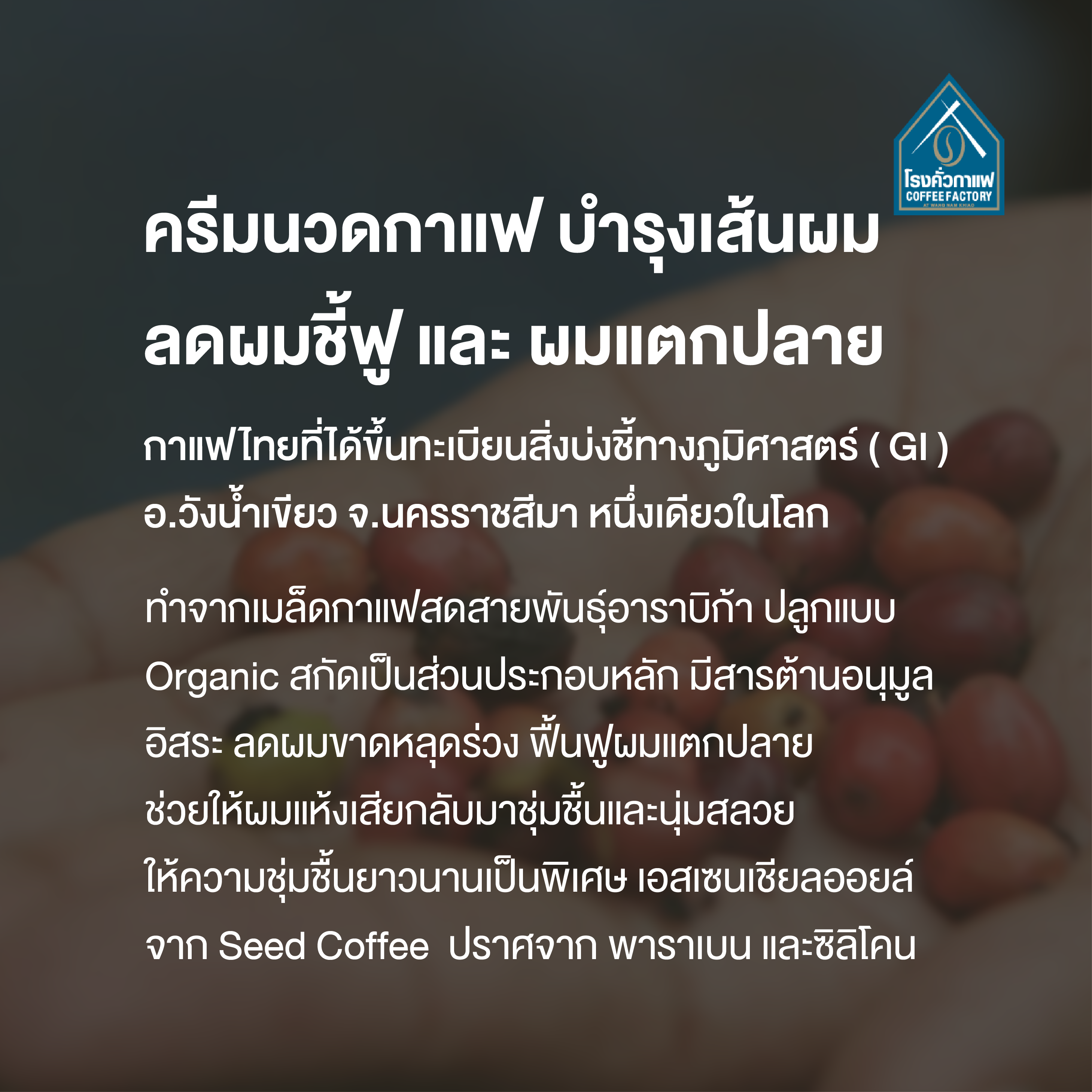ครีมนวดผมกาแฟ Hair Conditioner Coffee 2 in 1 / Treatment +Conditioner บำรุงผมเสียให้กลับคืนสภาพดี- ลดอาการผมขาดหลุดร่าง ครีมนวดผมกาแฟ ลดผมขาดร่วง ฟื้นบำรุงผมแห้งเสีย Coffee Conditioner โรงคั่วกาแฟวังน้ำเขียว 200 ML. ทำจากเมล็ดกาแฟสดสายพันธุ์ ARABICA ปลูกแบบ Oranic สกัดเป็นส่วนประกอบหลัก มีสารต้านอนุมูลอิสระ ลดผมขาดหลุดร่วง ฟื้นฟูผมแตกปลาย ช่วยให้ผมแห้งเสียกลับมาชุ่มชื้นและนุ่มสลวย ให้ความชุ่มชื้นยาวนานเป็นพิเศษ เอสเซนเชียลออยล์จาก Seed Coffee ปราศจาก พาราเบน และซิลิโคน ครีมนวดกาแฟ จากกาแฟออแกนิก บำรุงเส้นผม ลดผมชี้ฟู แตกปลาย เส้นผมแข็งเเรง ชะโลมให้ทั่วกลางผมไปจนถึงปลายผม ทิ้งไว้ 3-5 นาที เเล้วล้างออก แนะนำการใช้งานคู่กับแชมพูกาแฟ จัดส่งหลังจากได้รับคำสั่งซื้อ 1-2 วัน Concept ของเรา... Farm to Hand : ความพิถีพิถันตั้งเเต่ปลูกไปจนถึงผลิตกาแฟจากไร่สู่มือลูกค้า Community : การช่วยเหลือเกษตรกร รัฐวิสาหกิจชุมชน ช่วยให้เกษตรกรที่ปลูกกาแฟในเขนพื้นที่วังน้ำเขียว ได้มีรายได้ และ มีผลิตผลจากกาแฟเพื่อนำไปแปรรูป แล้วผลิตสินค้าจากกาแฟออกมา zero waste : ใช้ผลิตภัณฑ์จากกาแฟให้ rotate ได้สูงสุด , กาแฟที่ไม่ผ่านการคัดเลือก กลายเป็นปุ๋ยให้กับ ต้นกาแฟต่อไป, กาแฟที่คั่วเเล้วเเต่ไม่ได้คุณภาพก็สามารถนำไปทำสครัปกาแฟ